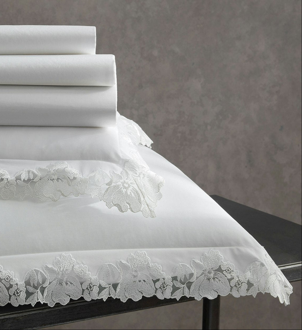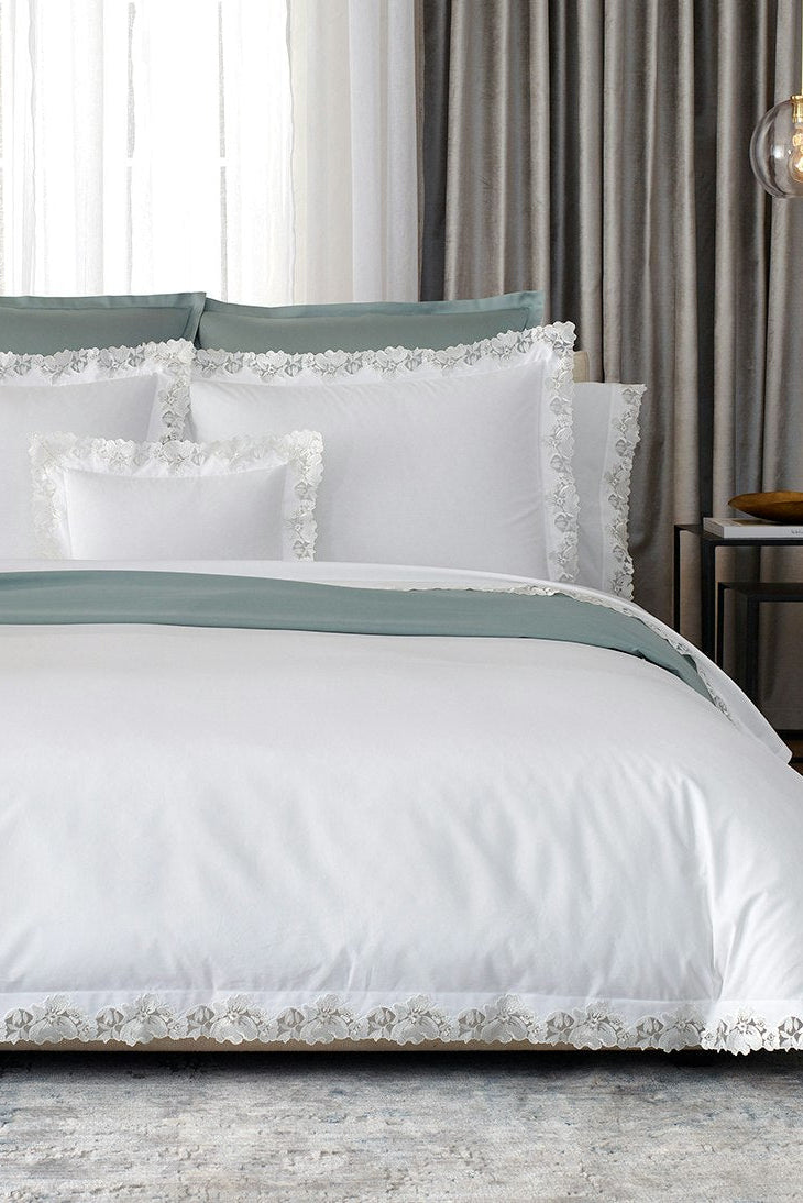 Virginia looks back to the early years importing lace, a special nod to Matouk's 90th anniversary. For this couture collection, an archive-inspired Swiss lace is cut and placed by hand on a supremely luxurious, 1000 thread count Gatsby Giza Egyptian cotton percale.