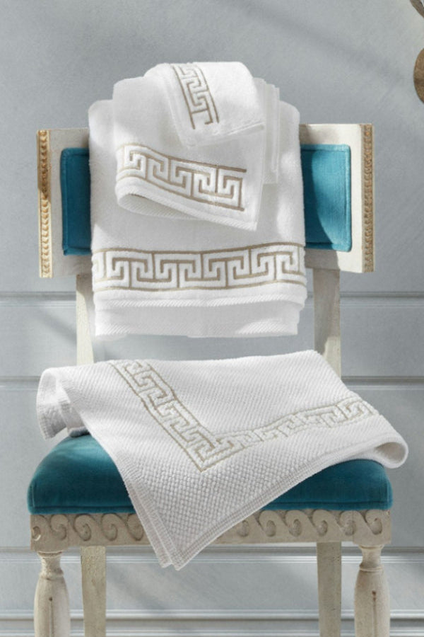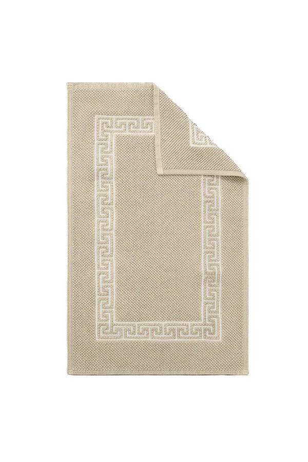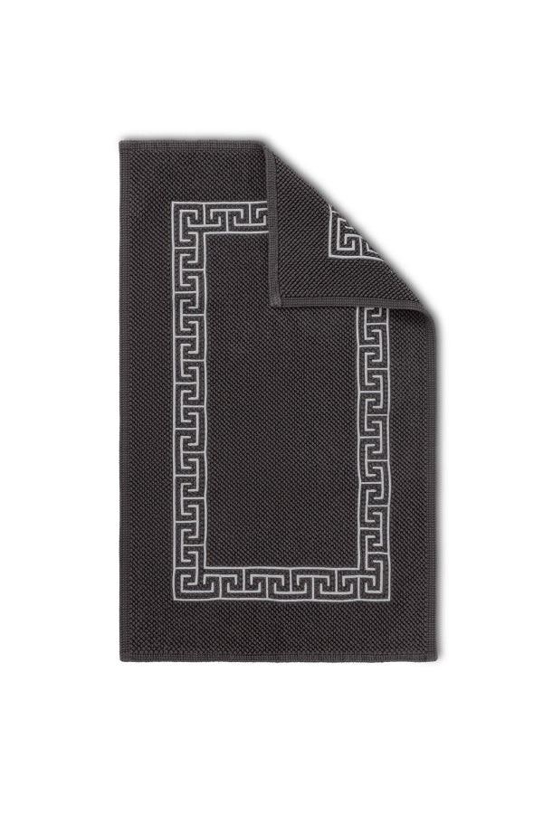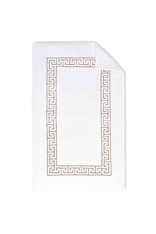 Adelphi's signature geometric frame embroidery is stitched onto our sublime Reverie rug. Sitting at the crossroads of classic and contemporary, Adelphi is our only stocked bath embroidery available on a solid colored base – making it all the more special.