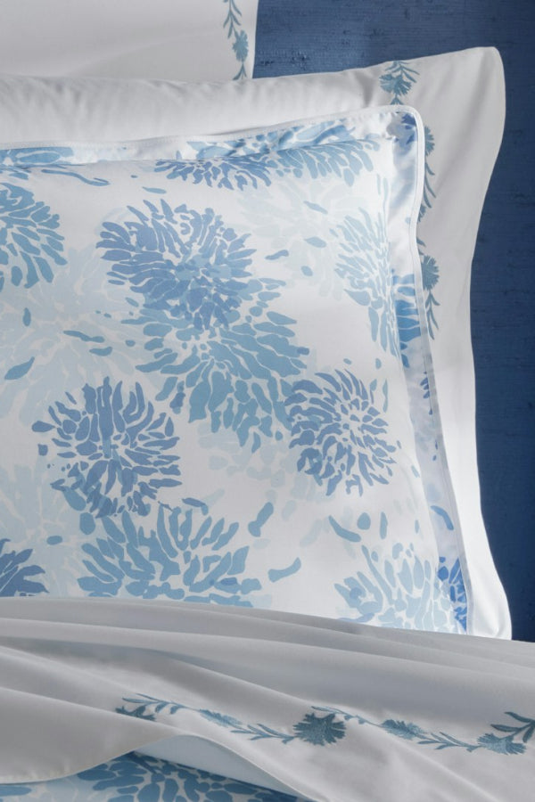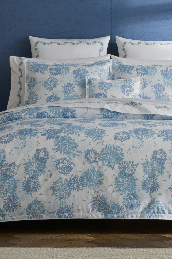 Chrysanthemum is a Matouk Tillett style inspired by one of Tillett Textiles's most iconic prints. Originally designed by DD Tillett and famously featured in Jacqueline Kennedy Onassis’s Hyannis Port home, this beautiful pattern on crisp Luca percale features a flowing floral motif and soft, painterly lines. It lends a graceful, romantic sensibility to the bed.